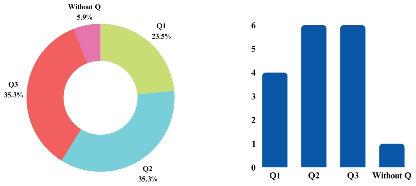 Among the published articles, 17 papers appeared in reputable international journals (ISI), and 11 papers were published in national scientific journals indexed in the ISC database. Among the published works, one book was released in Persian and one in English, reflecting the diversity of target audiences and the international orientation of the institute. An analysis of the ISI articles based on the JCR classification system shows that out of the 17 articles, 4 were ranked in Q1, 6 in Q2, 6 in Q3, and 1 article had no Q ranking. This qualitative distribution indicates the effective and targeted presence of the institute in high–impact scientific journals. In addition, among the ISC articles, 3 papers were also indexed in the international Scopus database, further increasing the scientific value and impact of these works.