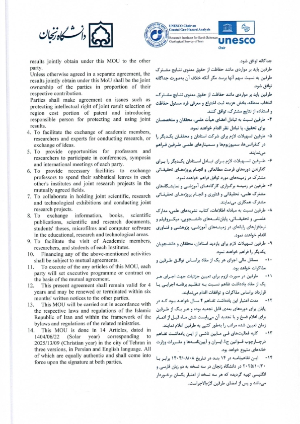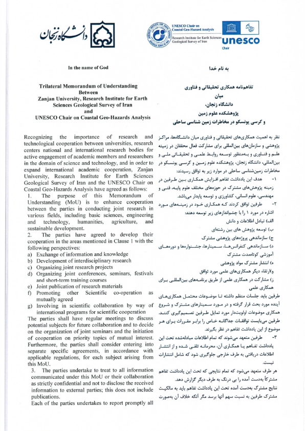 تفاهمنامه همکاری تحقیقاتی و فناوری میان دانشگاه زنجان، پژوهشکده علوم زمین و کرسی یونسکو در مخاطرات زمین شناختی ساحلی ارسال به دیگران نام شما ایمیل شما ایمیل دریافتکننده ارسال انصراف
