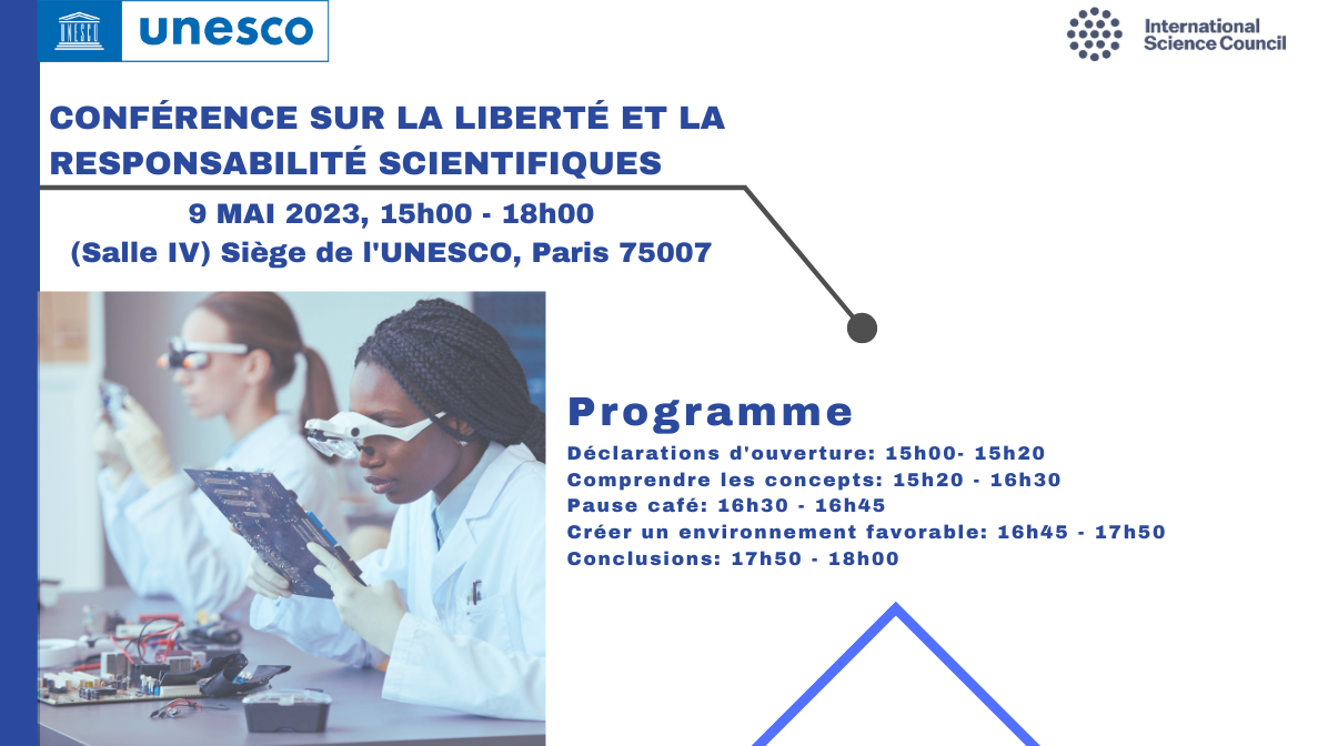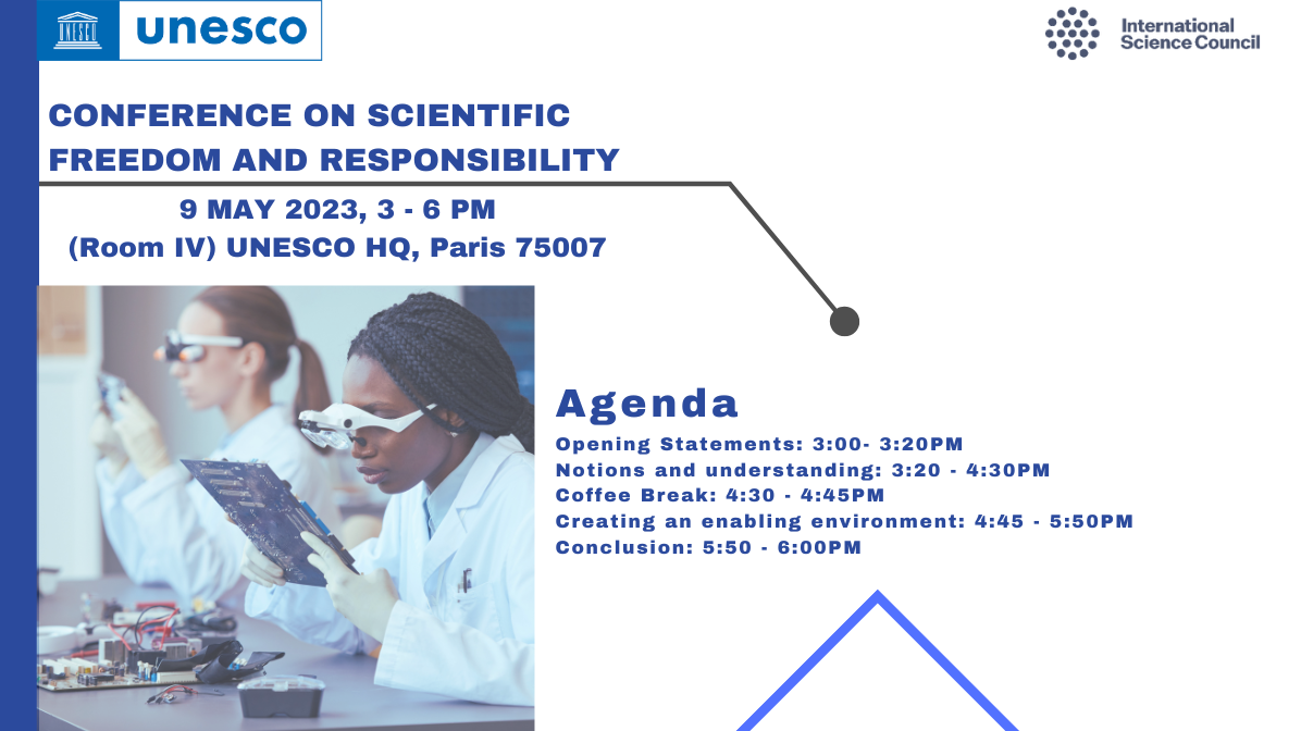 UNESCO has the pleasure to invite you to follow the Conference on Scientific Freedom and Responsibility, that it organizes jointly with the International Science Council on 9 May 2023 from 3 to 6 PM in Room IV at UNESCO Headquarters.