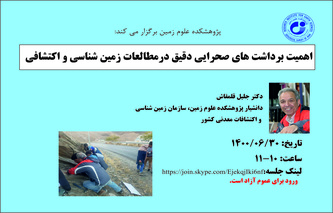 به اطلاع همکاران محترم هیات علمی پژوهشکده و علاقه مندان می رساند که آقای دکتر قلمقاش در تاریخ سه شنبه ۳۰ شهریور ۱۴۰۰ تحت عنوان "اهمیت برداشت های صحرایی دقیق در مطالعات زمین شناسی و اکتشافی" در سالن پژوهشکده سخنرانی خواهند داشت. لینک زیر جهت علاقه مندان به صورت مجازی خواهد بود.