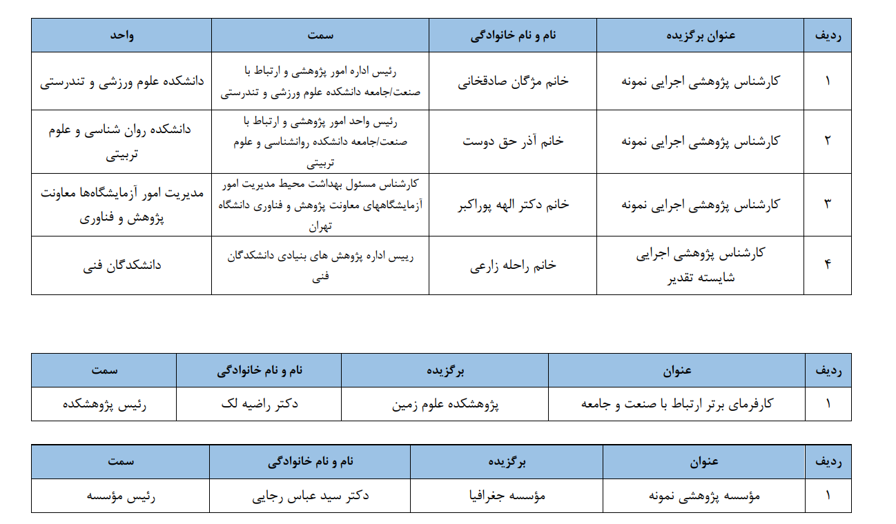 در سیوچهارمین جشنواره پژوهش و فناوری دانشگاه تهران، از سرکار خانم دکتر راضیه لک، رئیس پژوهشکده علوم زمین سازمان زمینشناسی کشور، بهعنوان کارفرمای برتر در حوزه ارتباط صنعت و جامعه تقدیر شد.
